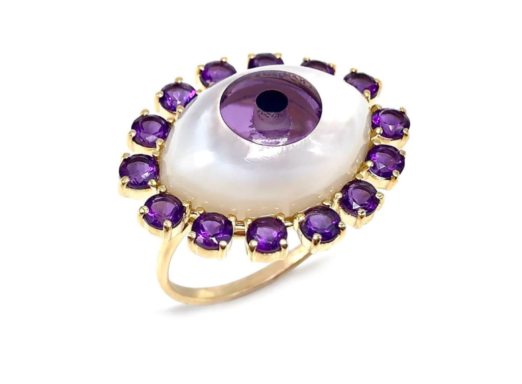 Descrição: anel em ouro amarelo, 18k, olho de horus em madrepérola com ametista.
